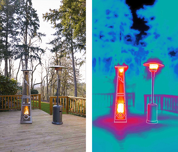 A thermal image of a wood pellet patio heater next to a propane patio heater.